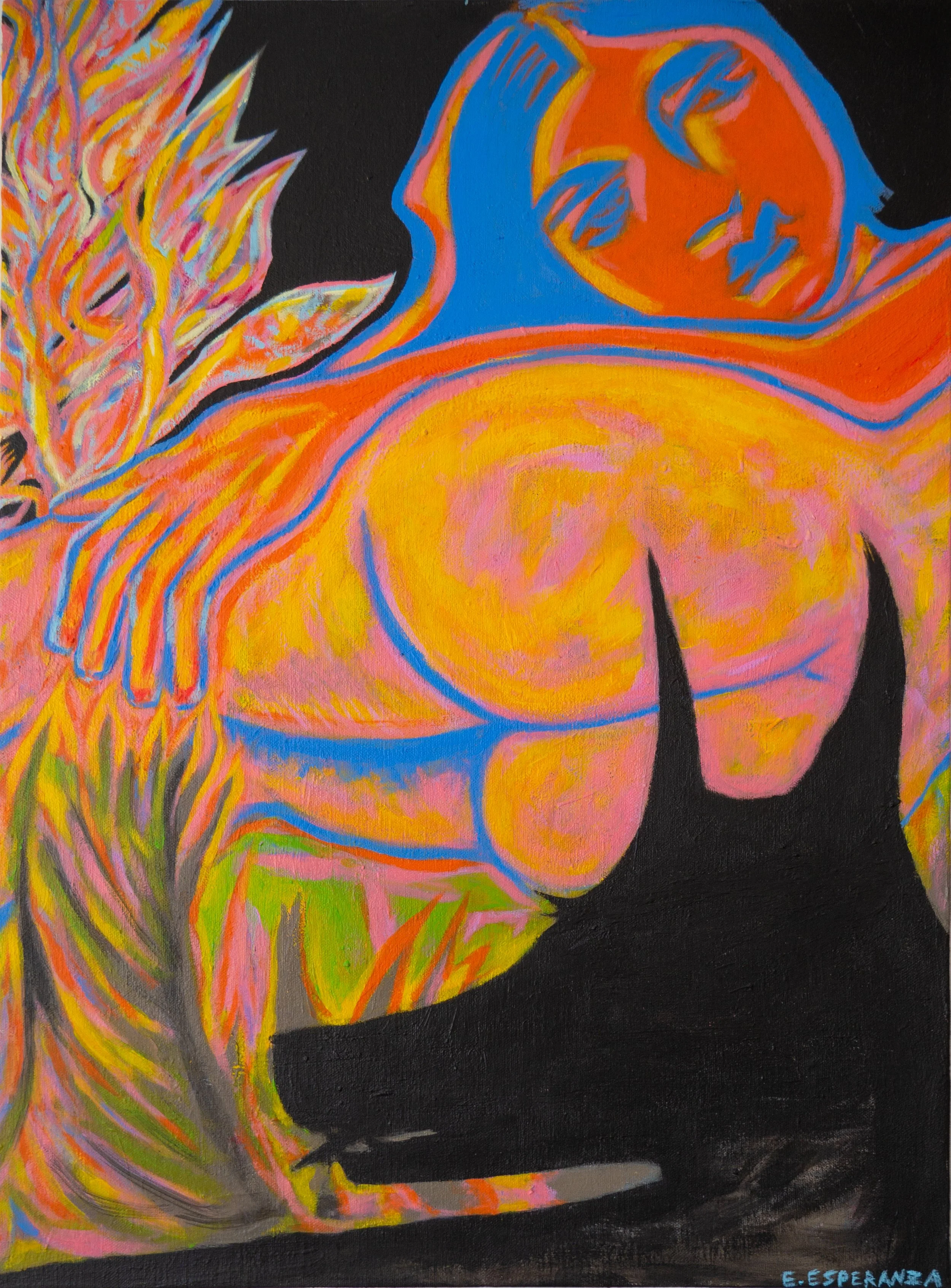 Ceremonia del colibrí, 20" x 24", acrylic on salvages canvas, 2023